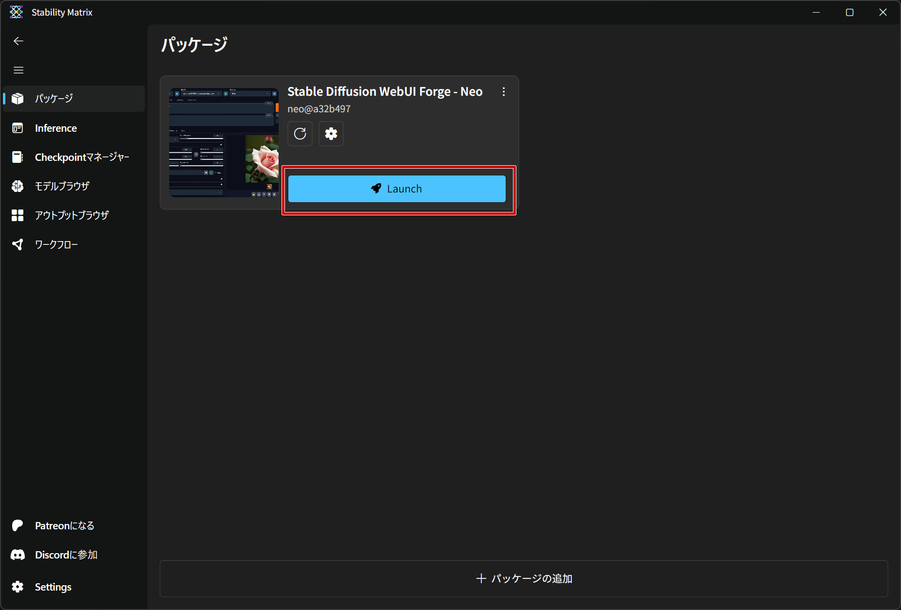 StabilityMatrixを起動、パッケージから「Stable Diffusion WebUI Forge – Neo」を起動します。
