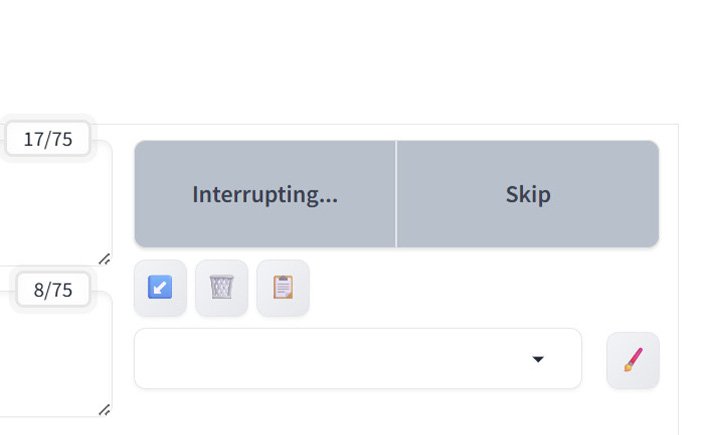 生成が始まると「Generate」ボタンが「Interrupt」へと変わります。生成途中で「Interrupt」をクリックすると「Interrupting…」となり、現在生成している画像の生成を止めます。複数枚の画像を生成している、つまりキューが複数ある場合でも全行程を停止させます。