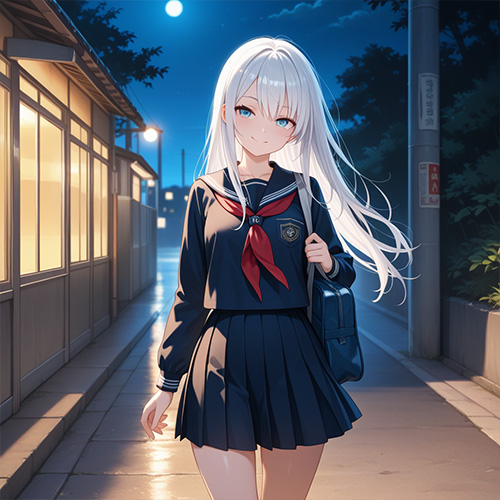 髪色を「銀髪(white hair silver hair)、衣装を「学校の制服(schooluniform)」、カメラングルを「膝から上(cowboy shot)」、背景を「夜間、月夜(night, moonlight)」へ変更。