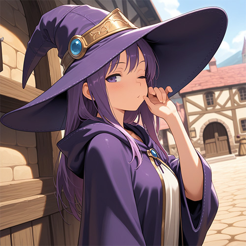 「紫髪(purple hair)」「片目を閉じる(one eye closed)」「魔法使いスタイル(Mage, Wizard robe, Wizard Hat)」「横からのアングル(side angle)」「中世風のファンタジー背景(Medieval town, fantasy)」へ変更。