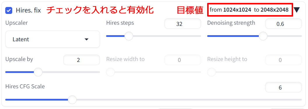 「Upscale by」で値を「2」にすると、例えば「1024×1024」が縦横「2倍」になり「2048×2048」になります。