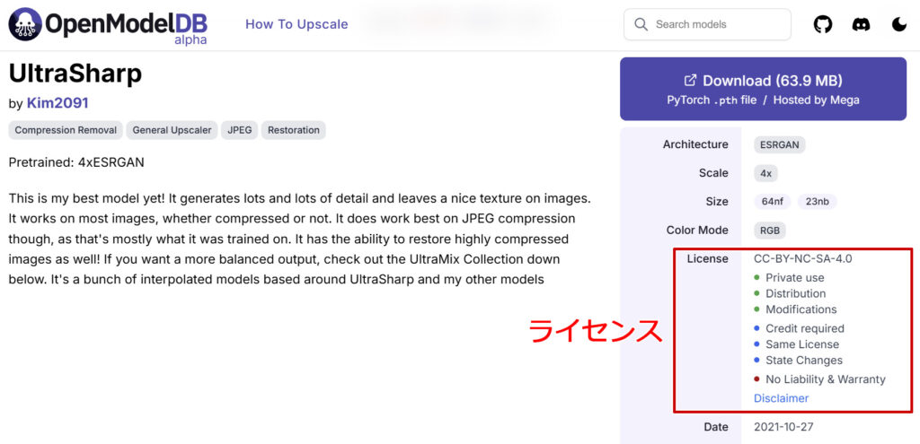アップスケーラーを通して生成した画像もライセンスが引き継がれるのか、というのはまだ生成AIに関する法整備が曖昧な現時点では中々厳密な答えがないような状況なので、各人のモラルに任せる部分もあるかと思いますが、モデルやLoRAだけでなくアップスケーラーにもライセンスがあることは認識しておいてください。