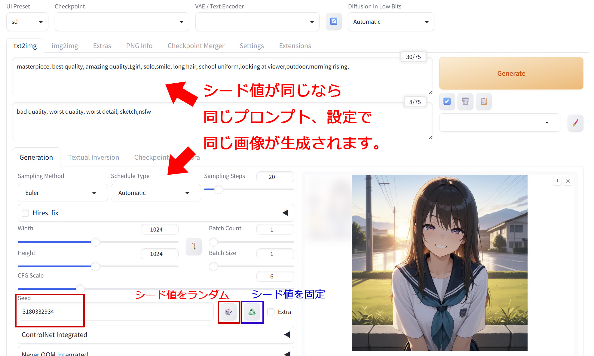 生成した直後であれば、「txt2imag」の「Generation」タグで生成画像のすぐ下に、この画像を生成したときのプロンプトや各種設定などが表示されています。