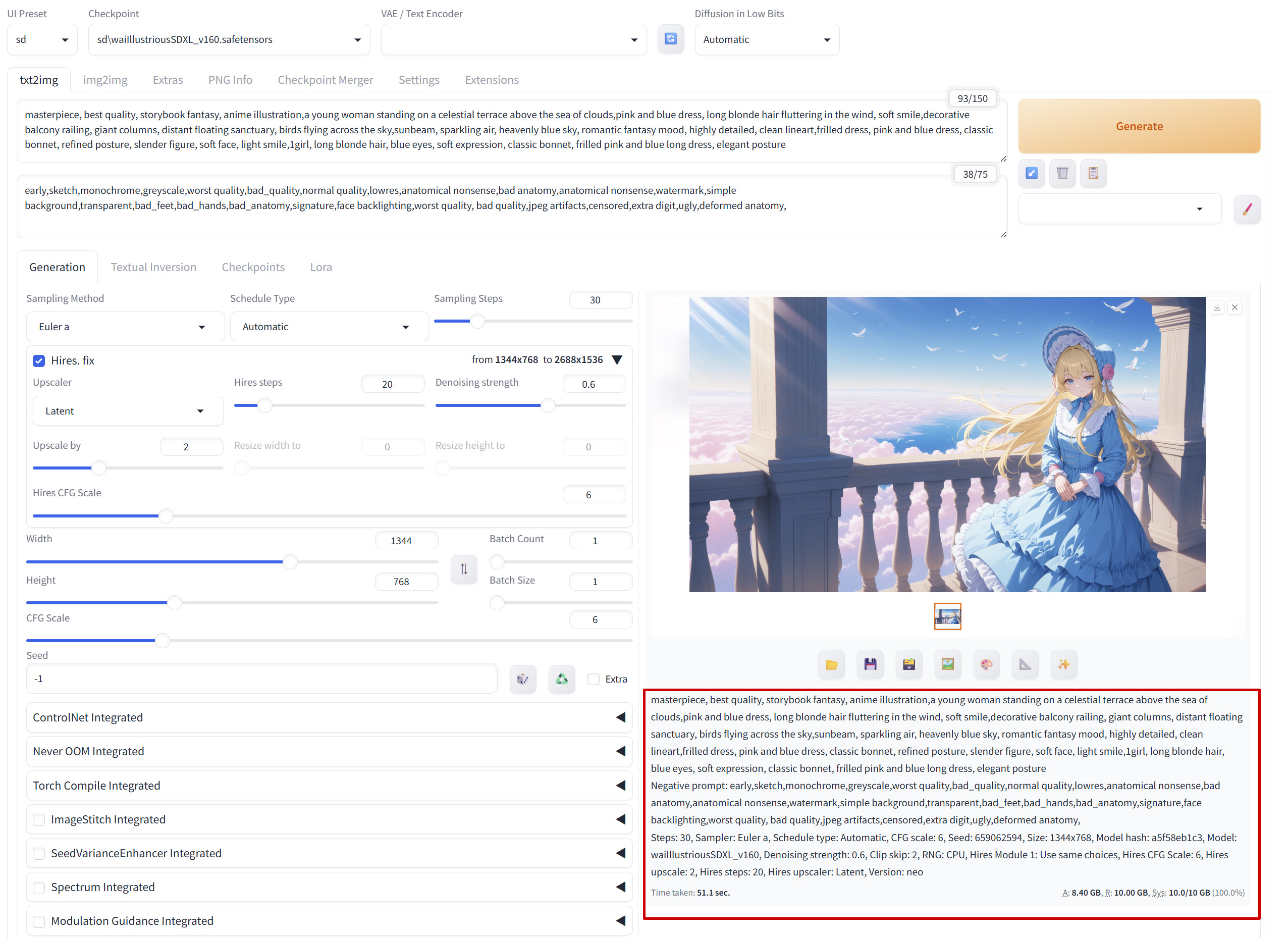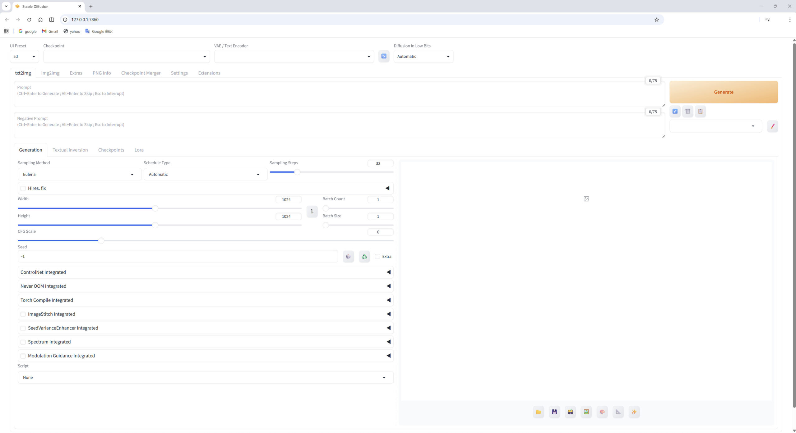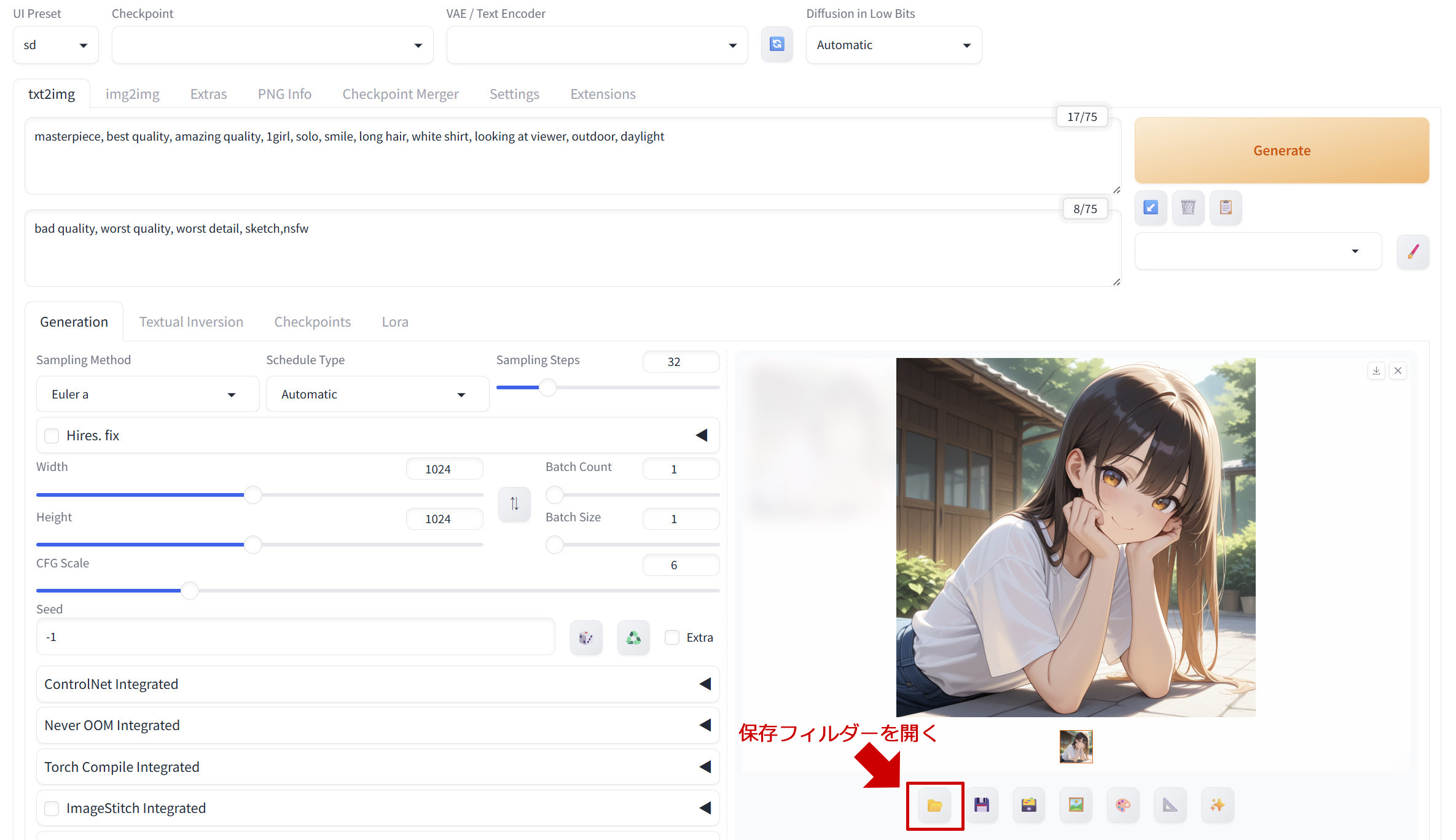 チェックポイントを指定し、プロンプトを入力したら、右上の「Generate」ボタンを選択します。生成中になるとボタンが「Interrupt」ボタンに表記が変わります。因みに、ショートカットキー「Ctrl+Enter」でも開始できます。