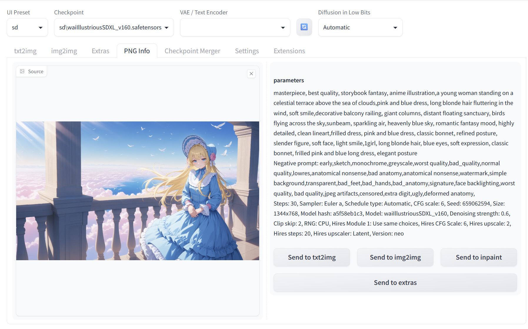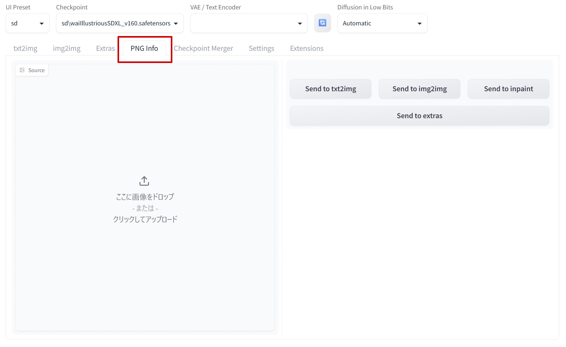 PNG Info では、画像に埋め込まれた生成情報を読み取るだけでなく、その内容を「txt2img」「img2img」「inpaint」「extras」などの各タブへ送り返すことができます。
