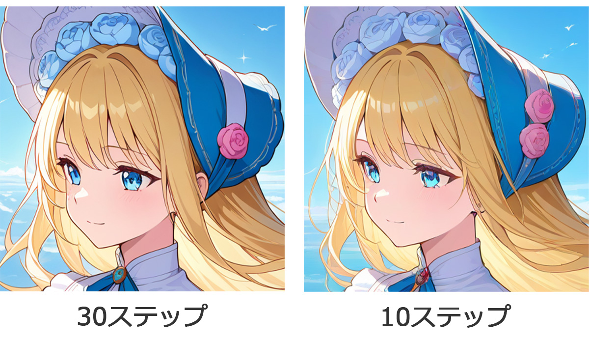 「0」にすると本生成のステップ数と同じ回数だけ高解像度化処理が行われます。ただ、本生成時である程度は繊細になっておりノイズが少ない状態なので、本生成時のステップ数より少なくても大丈夫です。ステップが多くても結果はあまり変わらず生成時間だけ増えるので、本生成の半分程度でよいかと思います。