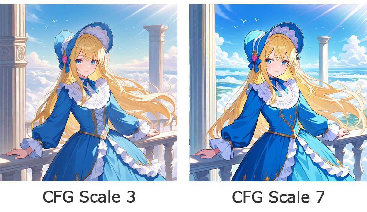 値を上げるほどプロンプトへの忠実度が強くなります。このため、細部の構図や情景をより忠実に反映してさらにディテールを強化することができますが、高くしすぎると通常のCFGスケールと同じく過剰に要素が強調され焼けた感じになったり、粒状感、硬い陰影、不自然な輪郭が出やすくなったりします。