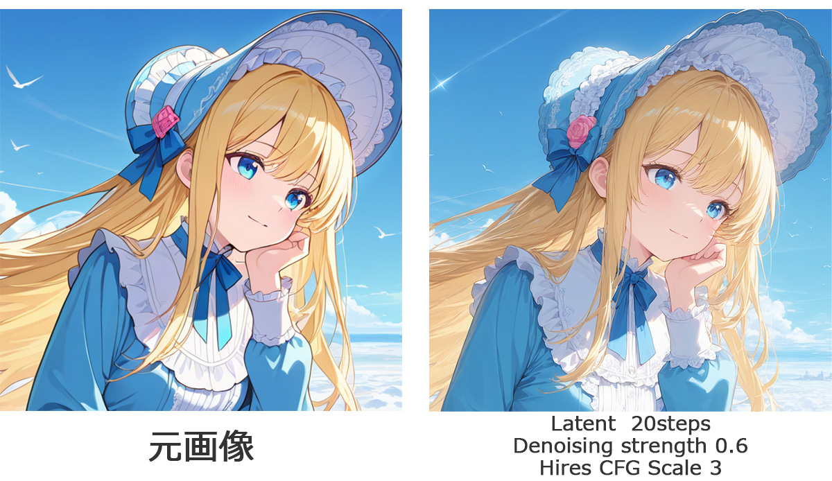 出力される画像を元に拡大処理を始めるので、全く変化しないわけではありませんがLatentより構図が安定しやすく、そのまま髪の毛、布地、背景の細かな模様などで「描き込みが増えた」ように見えやすくなります。ただ、過剰にシャープになることがあり、イラスト系では質感が変化することがあります。