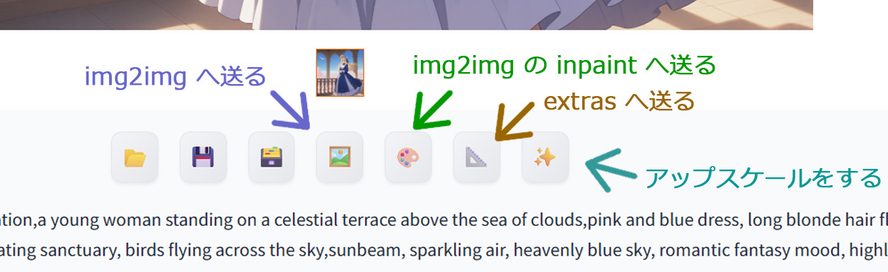 画像生成後、すぐに生成画像をimg2imgなどへ送ることもできます。