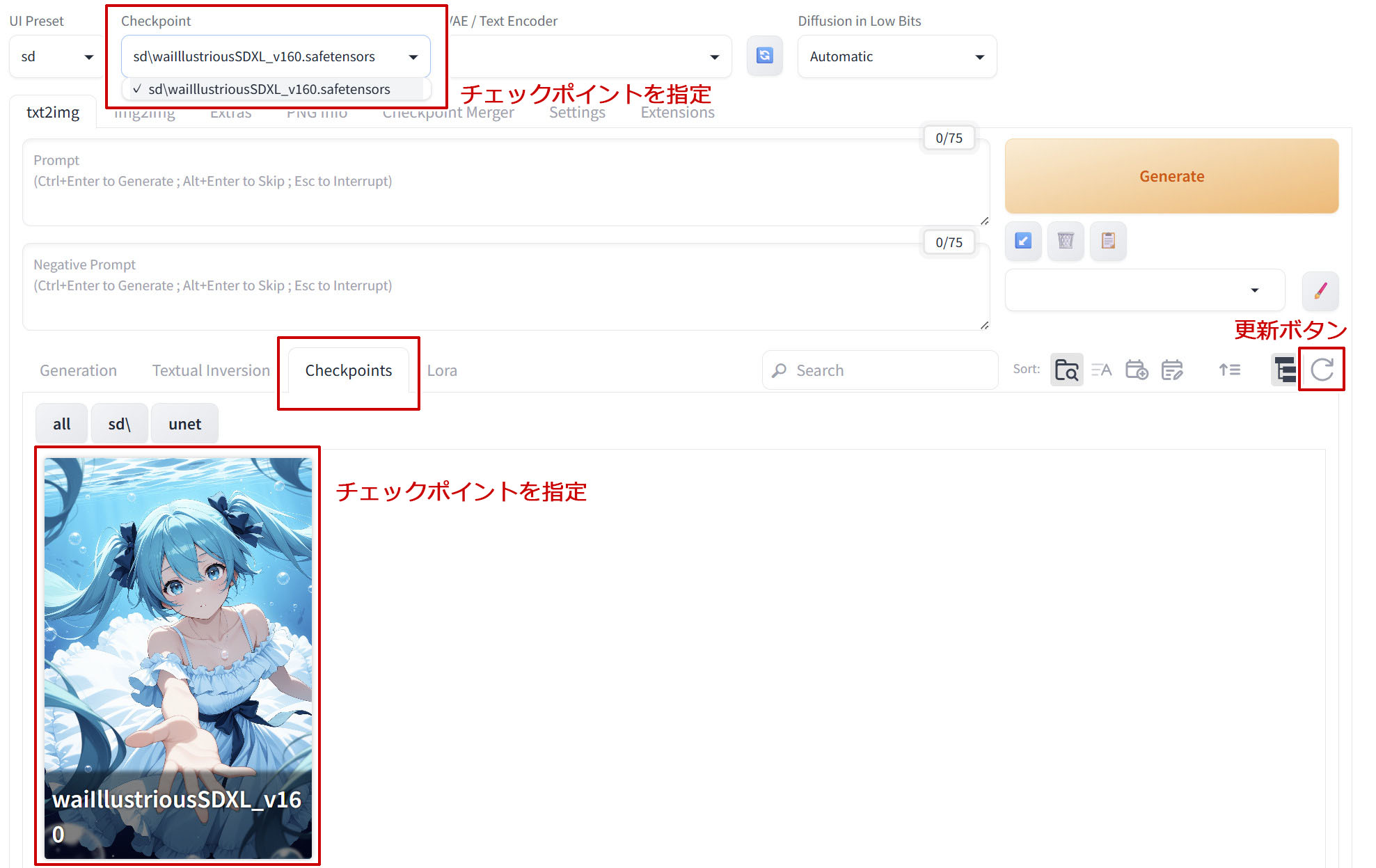 使用したいチェックポイントが見当たらない場合は、一番右にある更新ボタンを選択して再読み込みしてみてください。(一番上のDiffusion in Low Bitsの左にあるアイコンでも更新は可能。)