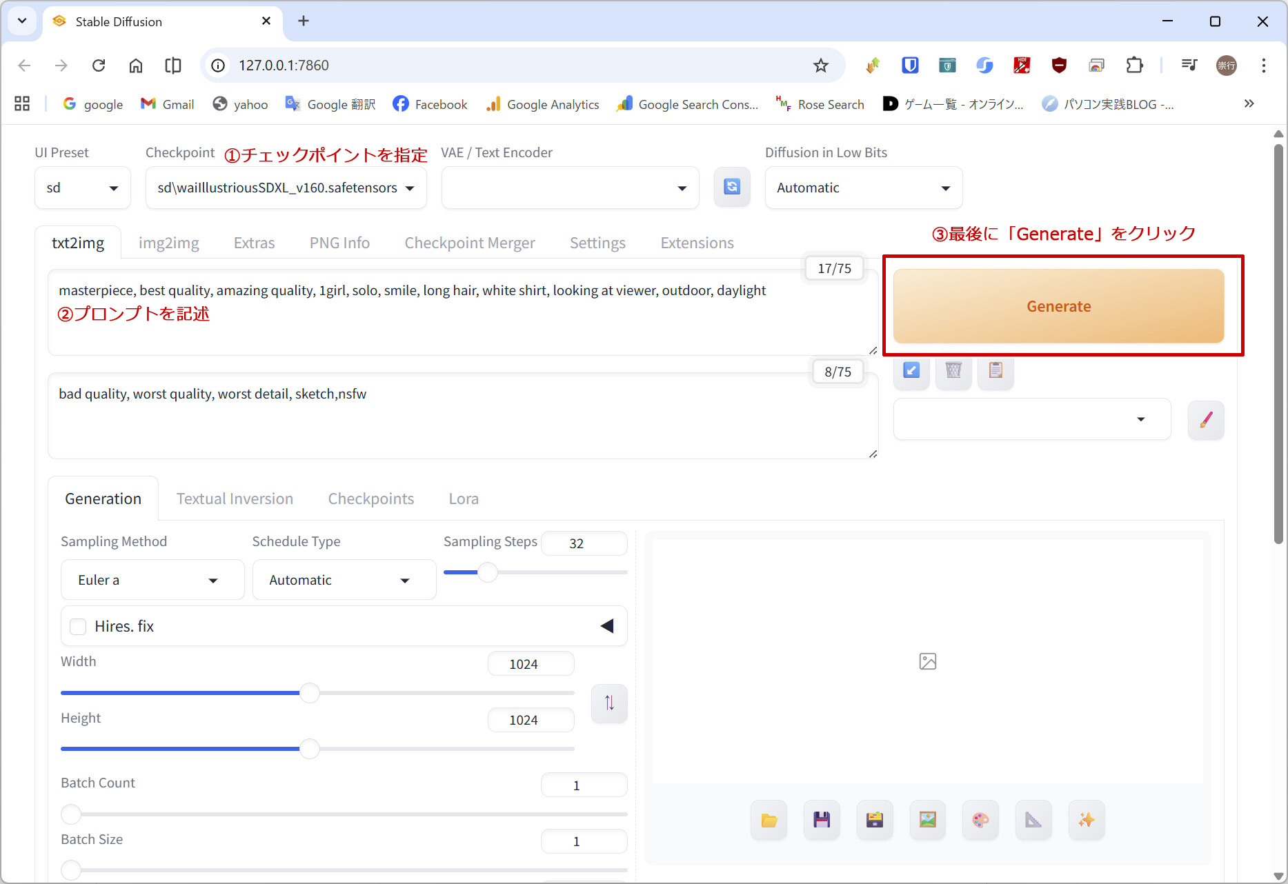 画面内に色々と設定する箇所がありますが、いったん後回しにして「まずは最初の1枚」を生成してみましょう。