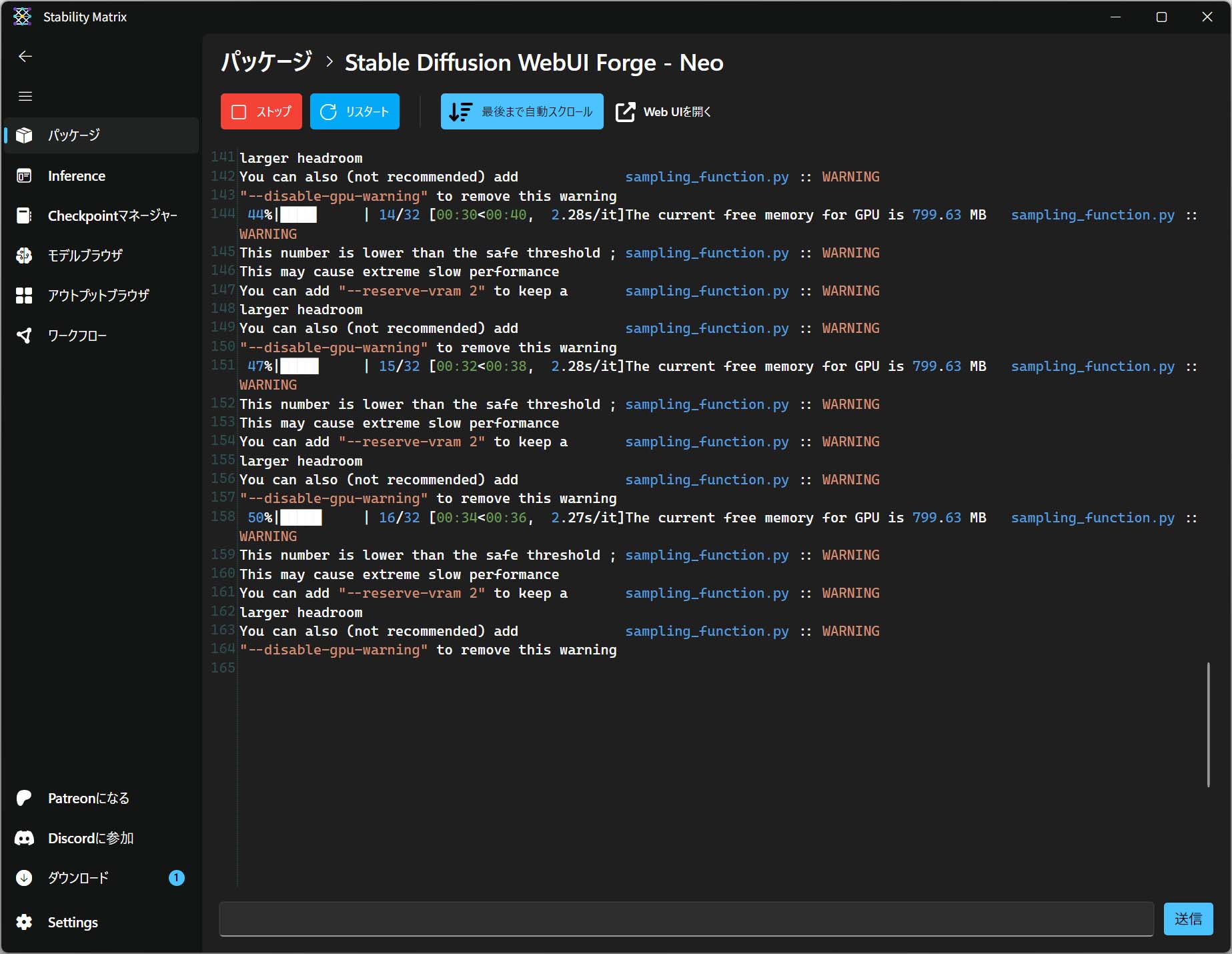 タスクマネージャーなどで確認するとストレージでチェックポイントのロードが始まること、ロードが終わるとGPUが頑張り始めるのが分かります。また、StabilityMatrixでは生成中の進捗状況が詳しく分かります。